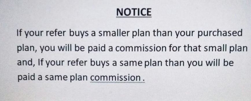 Each Commission on Your Plan Will be Given to You Only if You Register a new User From Your Reference. You Will not be Paid any Commission of that Plan You Get.